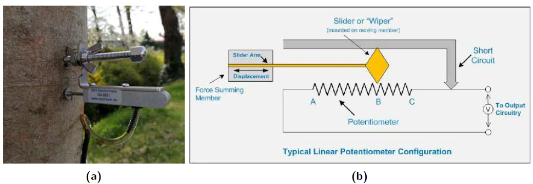Figure 2: A DR3 point dendrometer attached to a tree stem and a diagram of the working principle of a potentiometer.